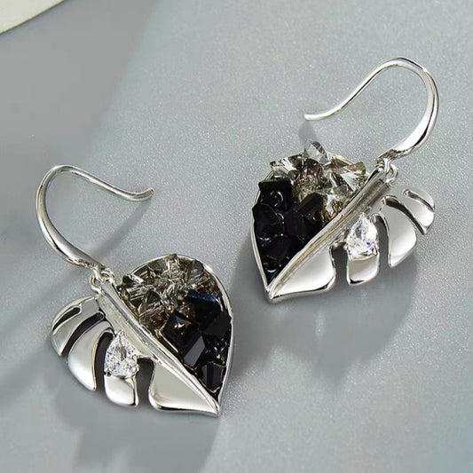 14K Gold-Plated Black Crystal Leaf Ear Hook Earrings
