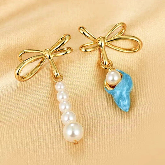 14K Gold-Plated Blue Asymmetrical Conch Pearl Bow Earrings