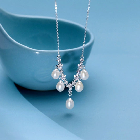 Sterling Silver Luxury Diamond-Set Qurora Pearl Necklaces