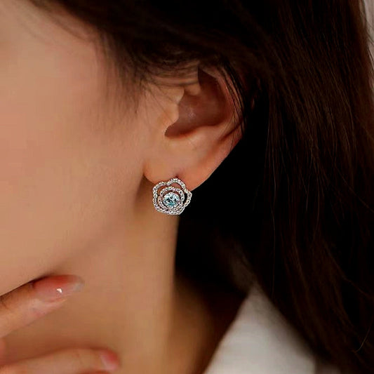 Sterling Silver Blue Zircon Camellia Stud Earrings