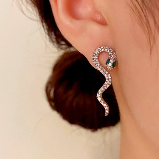 14K Gold-Plated Elegant Zircon Snake-Shaped Emerald Heart Earrings