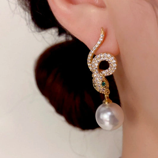 14K Gold-Plated Elegant Zircon Snake-Shaped Pearl Earrings