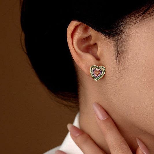 14K Gold-Plated Zircon Diamond Heart Stud Earrings