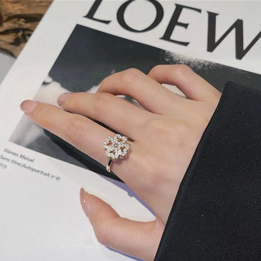 14K Gold-Plated Rotatable Diamond Four-Leaf Clover Heart Rings