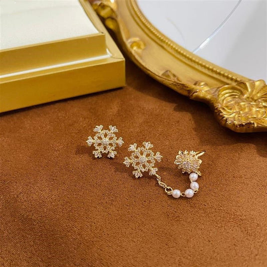 Silver Post Zircon Snowflake Pearl Asymmetric Earrings