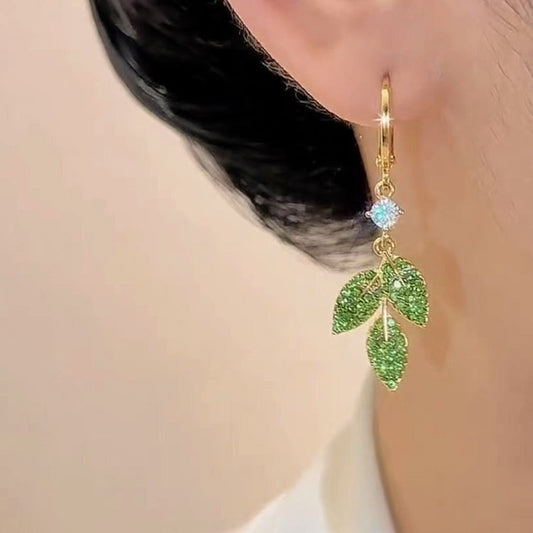 14K Gold-Plated Elegant Green Diamond Leaf Earrings
