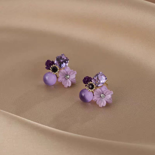 Silver Post Purple Crystal Small Flower Stud Earrings