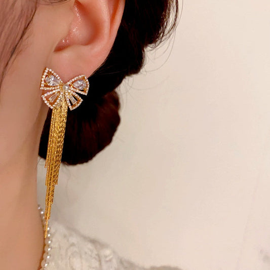 14K Gold-Plated Elegant Zircon Bow Tassel Earrings