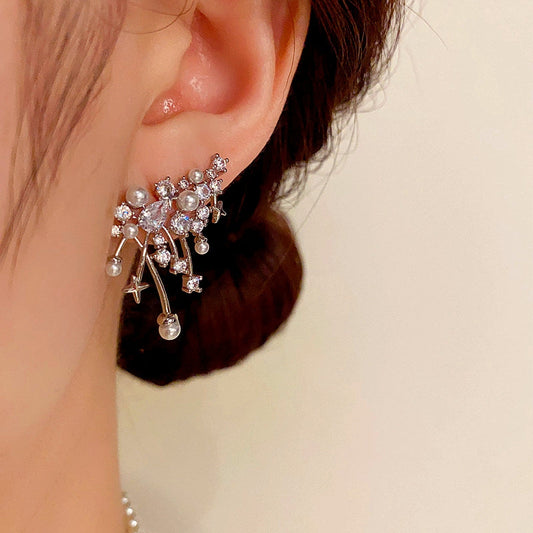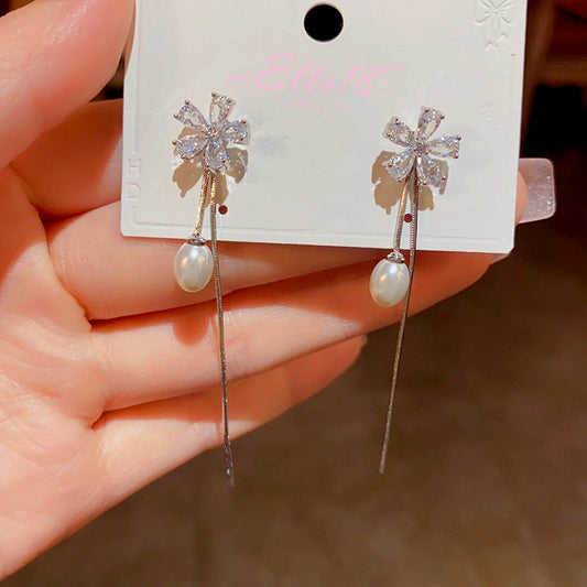 14K Gold-plated Elegant Zircon Flower Pearl Tassel Earrings