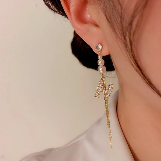 14K Gold-plated Elegant Letter H Pearl Tassel Earrings