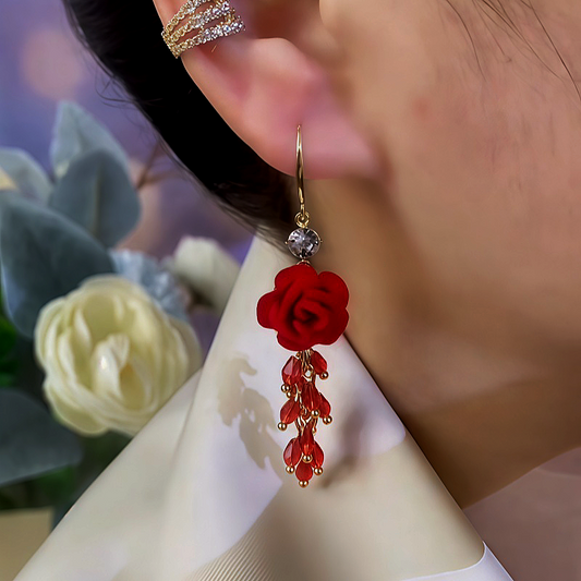 14K Gold-Plated Red Rose Tassel Ear Hooks