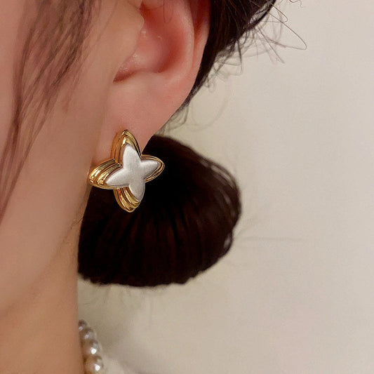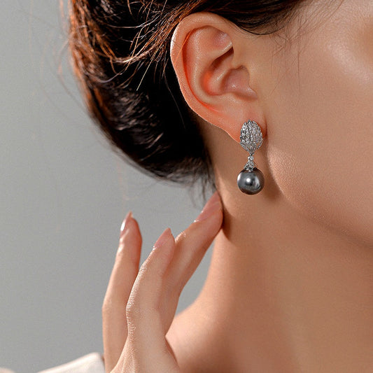 14K Gold-Plated Zircon Leaf Gray Pearl Earrings