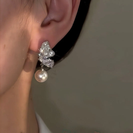 14K Gold-Plated Zircon Butterfly Pearl Earrings