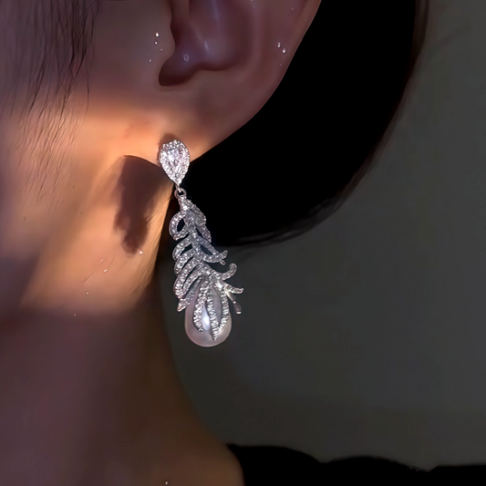 14K Gold-Plated Zircon Feather Pearl Earrings