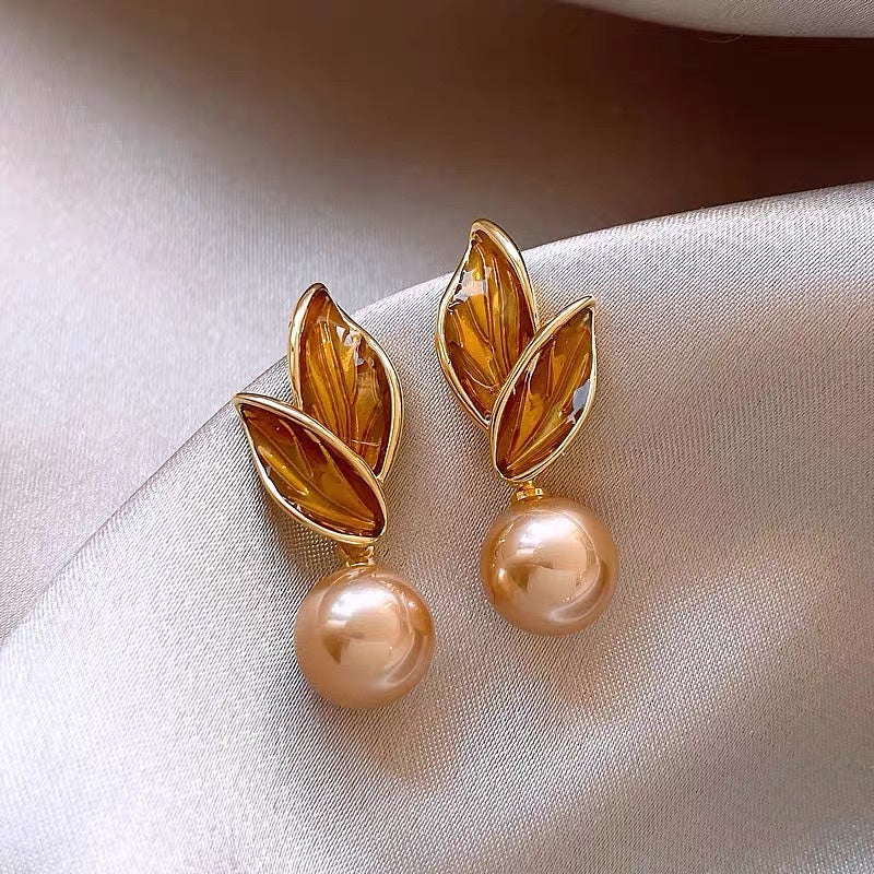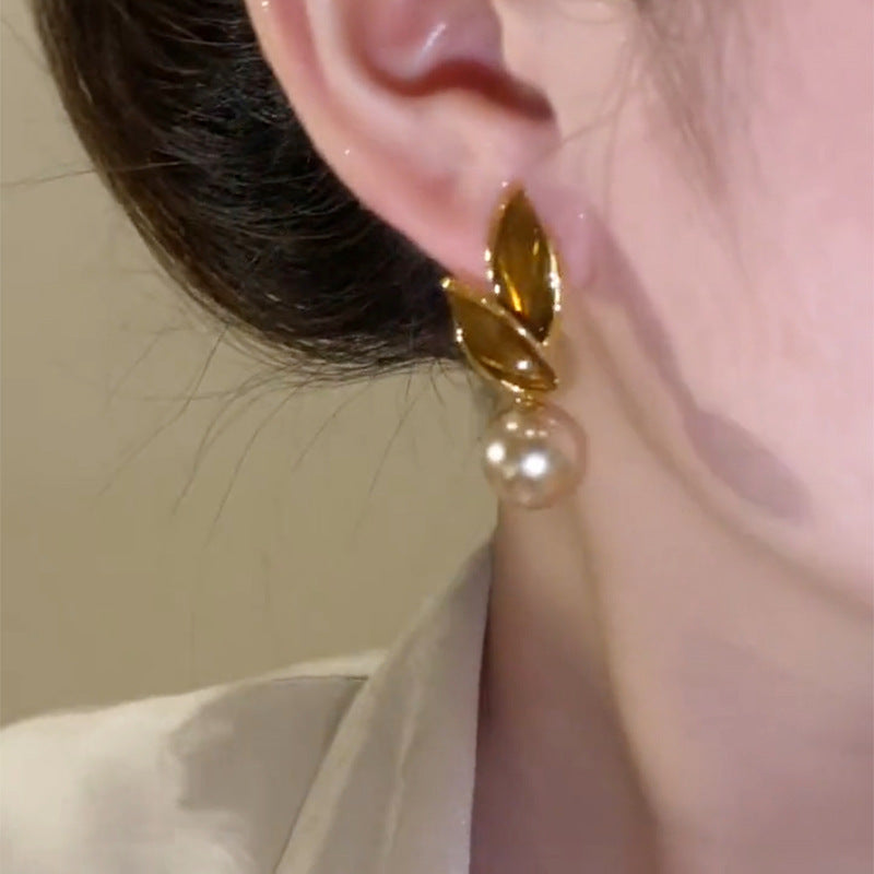 14K Gold-plated Artificial Pearl Leaf Earrings