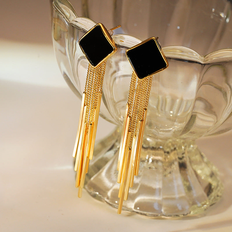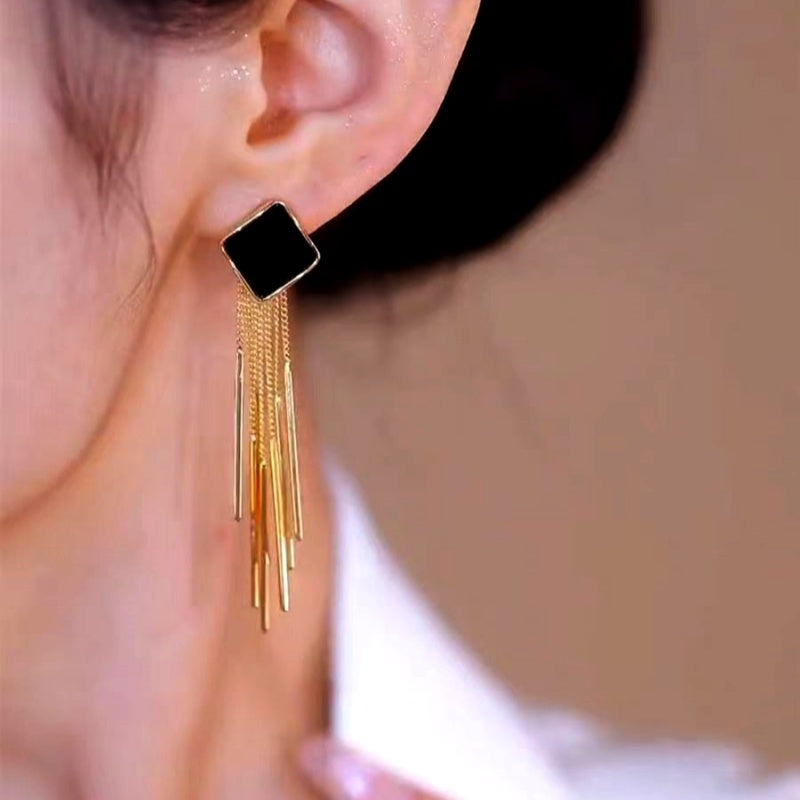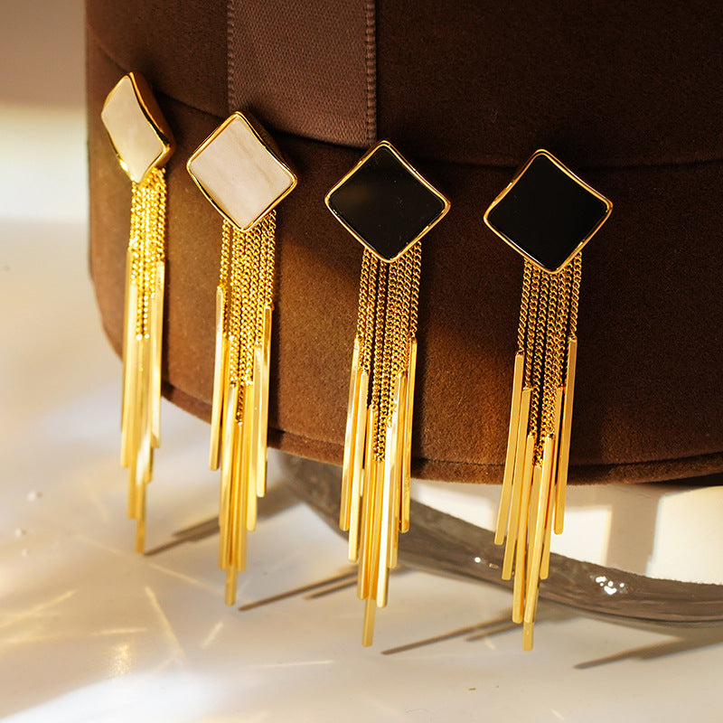 14K Gold-Plated Black And White Rhombus Long Earrings
