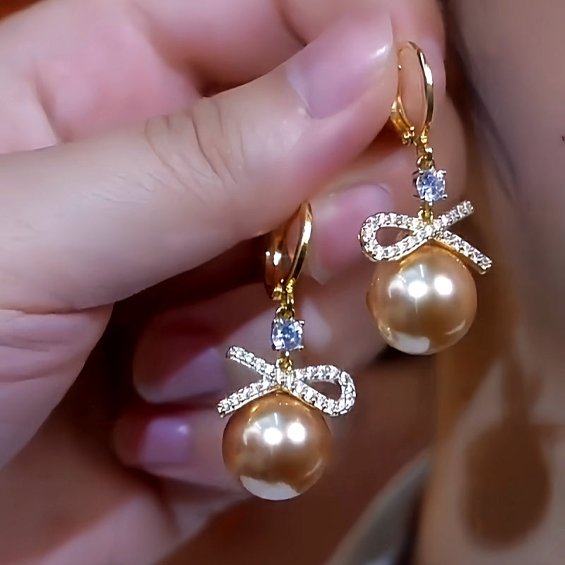 14K Gold-Plated Brown Pearl Diamond Bow Earrings