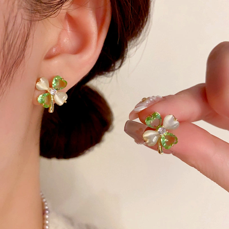 14K Gold-Plated Cat's Eye Green Four-Leaf Flower Earrings