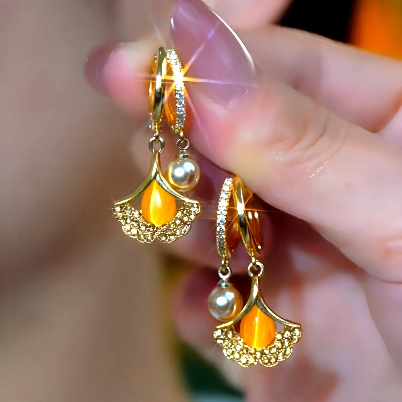 14K Gold-Plated Cat's Eye Stone Ginkgo Leaf Earrings