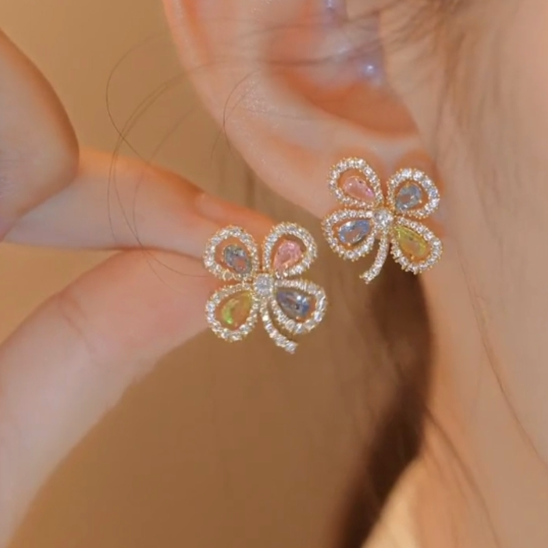 14K Gold-plated Colorful Four-Leaf Flower Diamond Stud Earrings
