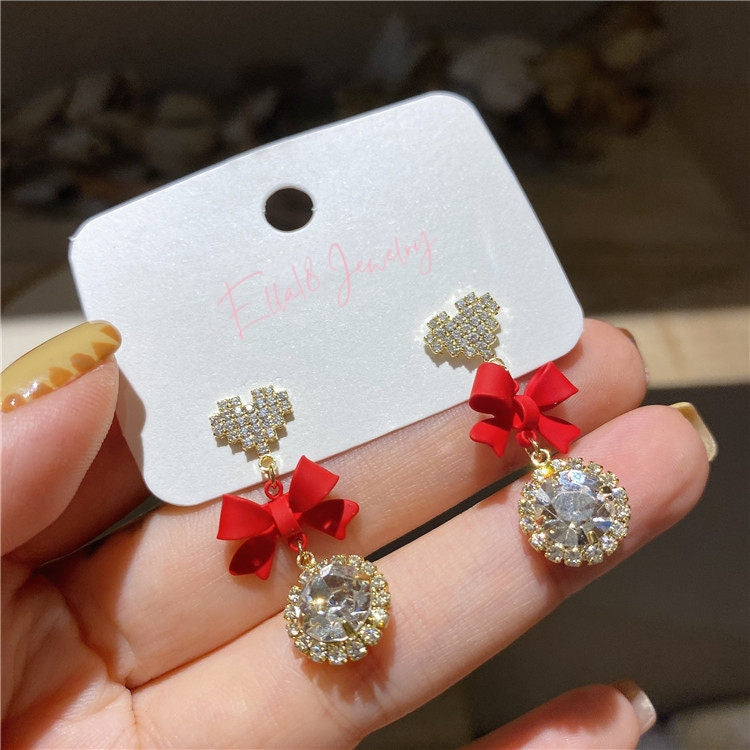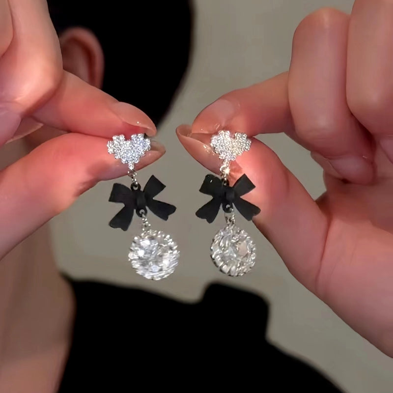 14K Gold-Plated Diamond Heart Bow Crystal Earrings