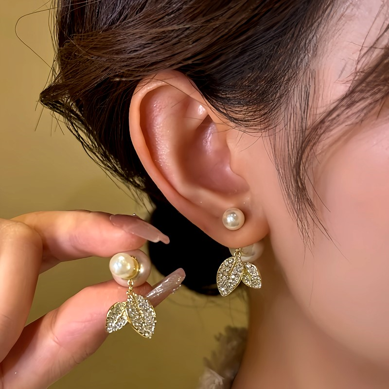 14K Gold-Plated Diamond Leaf Pearl Earrings