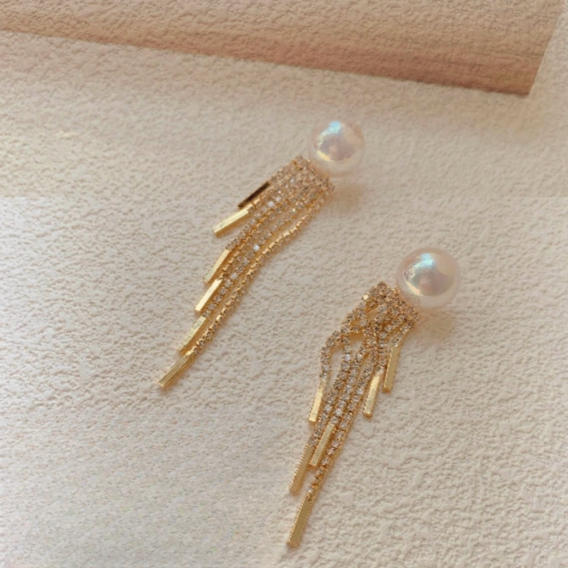 14K Gold Plated Diamond Pearl Tassel Earrings