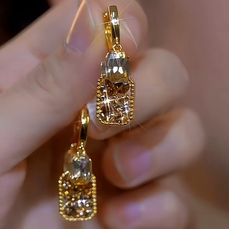 14K Gold-plated Diamond-Studded Brown Crystal Square Earrings