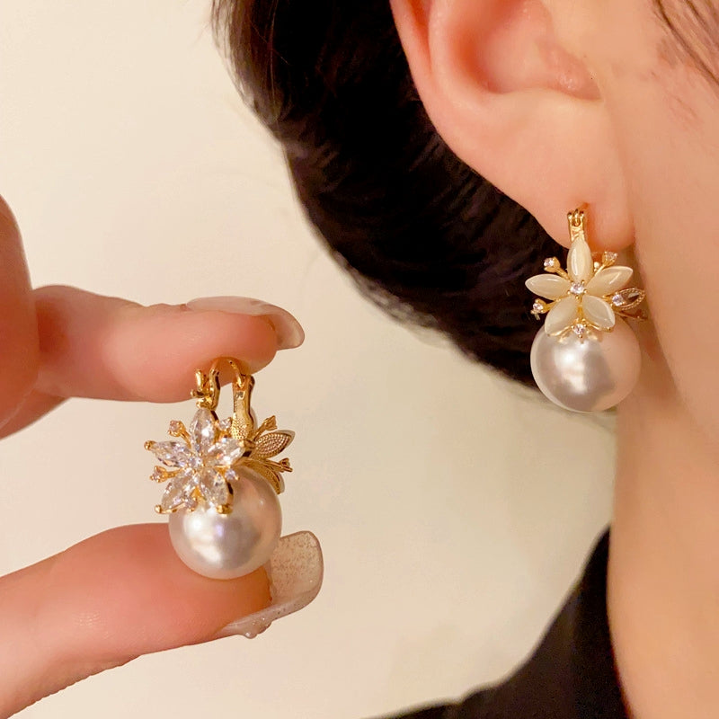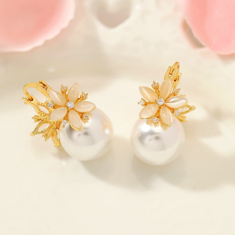 14K Gold-Plated Diamond-Studded Flower Pearl Earrings