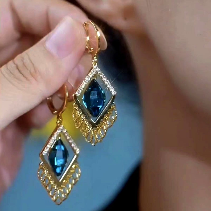14K Gold-Plated Elegant Blue Geometric Diamond Crystal Earrings