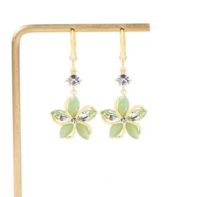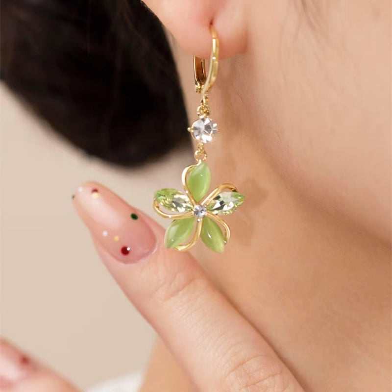 14K Gold-Plated Elegant Cat Eye Green Flower Earrings