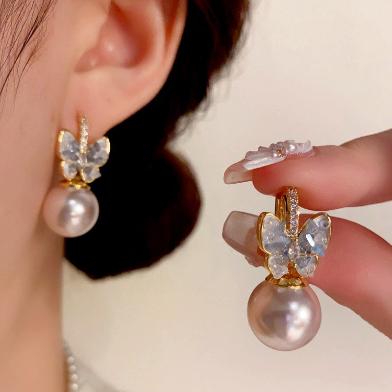 14K Gold-Plated Elegant Crystal Butterfly Pendant Pearl Earrings