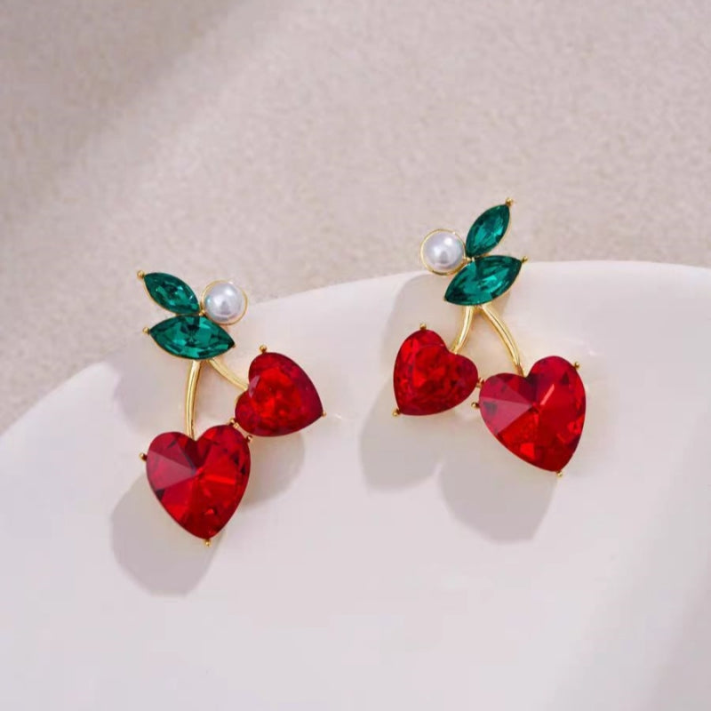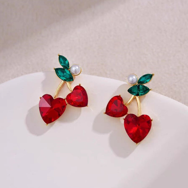 14K Gold-plated Elegant Diamond Crystal Heart-Shaped Cherry Earrings