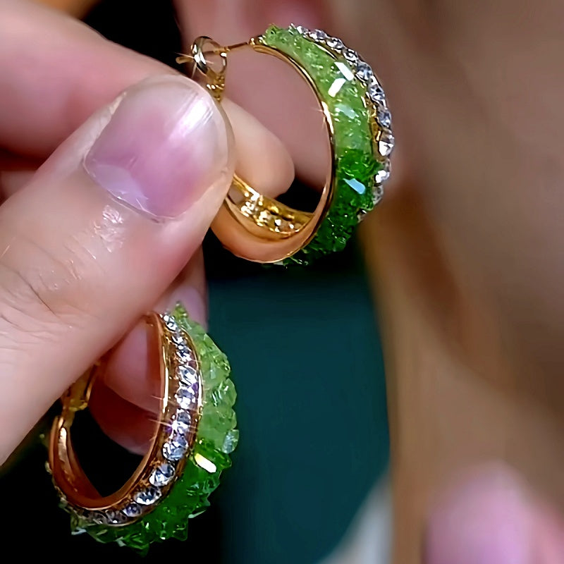 14K Gold-Plated Elegant Diamond-Encrusted Green Crystal Hoop Earrings