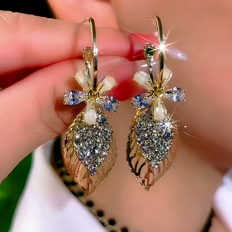 14K Gold-Plated Elegant Diamond Flower And Leaf Earrings
