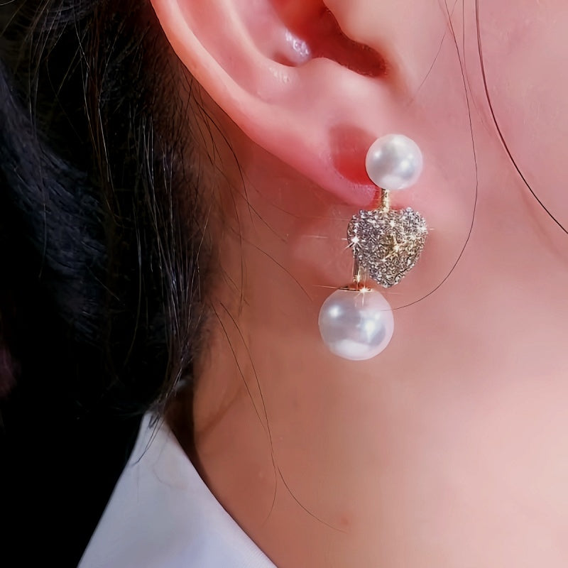 14K Gold-Plated Elegant Diamond Heart-Shaped Pearl Earrings