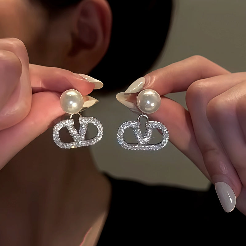 14K Gold-Plated Elegant Diamond V Letter Pearl Earrings
