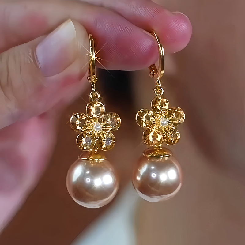 14K Gold-Plated Elegant Flower Champagne Pearl Earrings