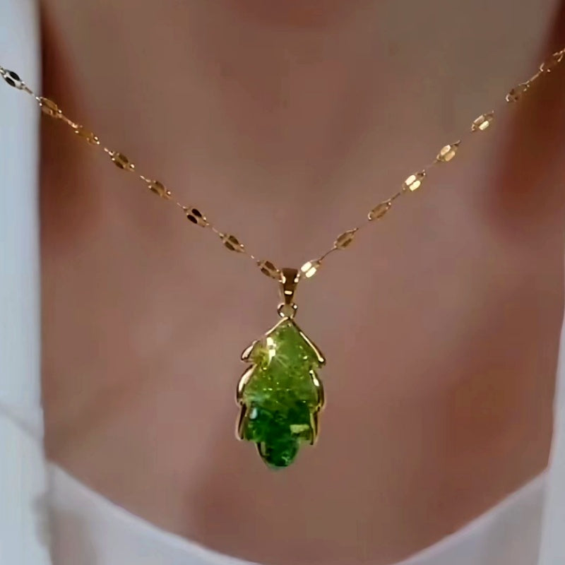 14K Gold-Plated Elegant Green Crystal Leaf Necklaces