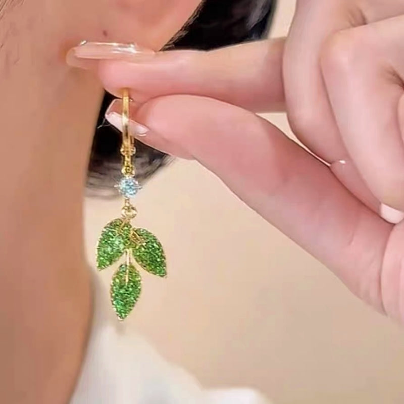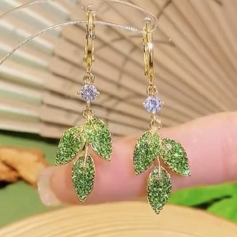 14K Gold-Plated Elegant Green Diamond Leaf Earrings