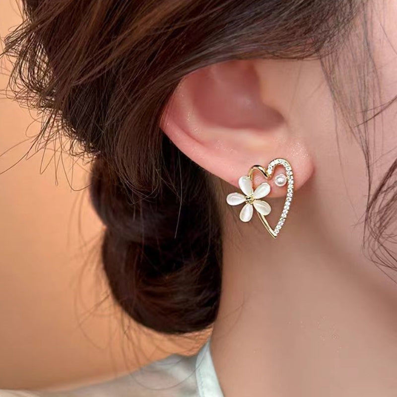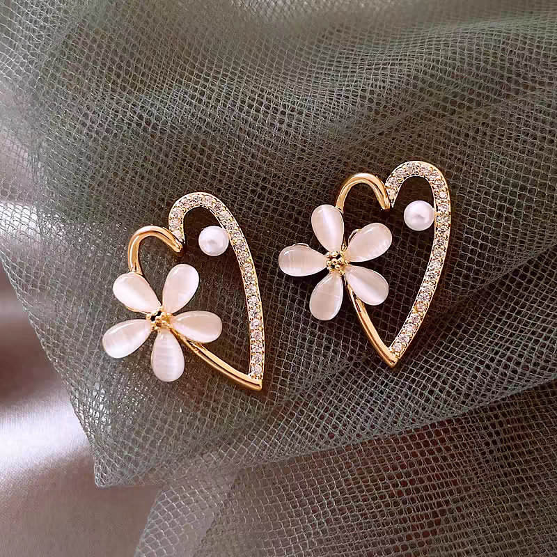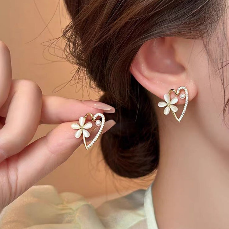 14K Gold-Plated Elegant Heart-Design Flower Stud Earrings