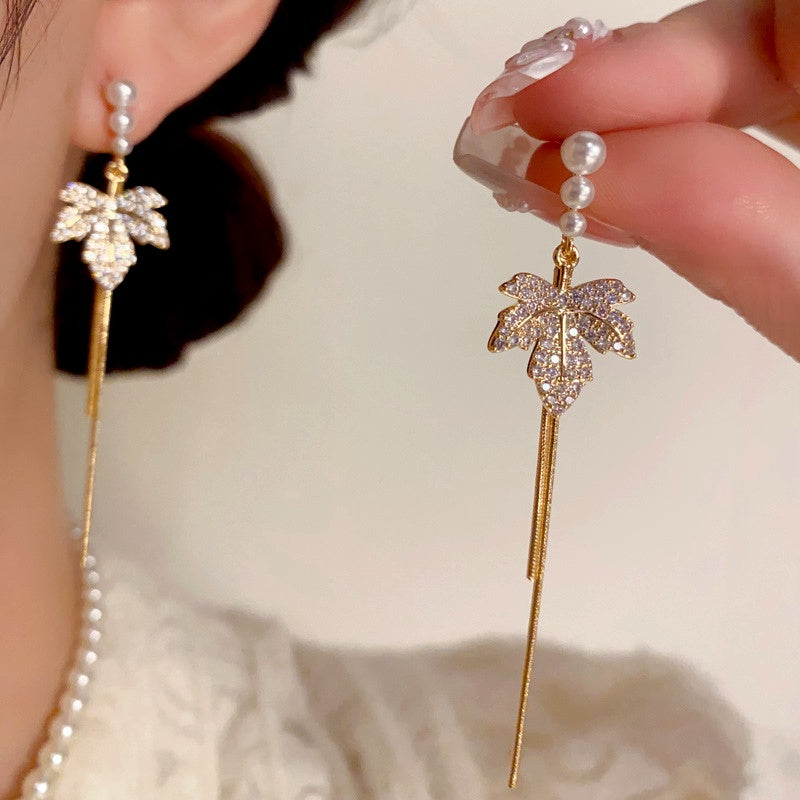 14K Gold-Plated Elegant Maple Leaf Pearl Tassel Earrings