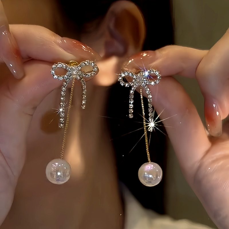 14K Gold-Plated Elegant Zircon Bow Pearl Earrings
