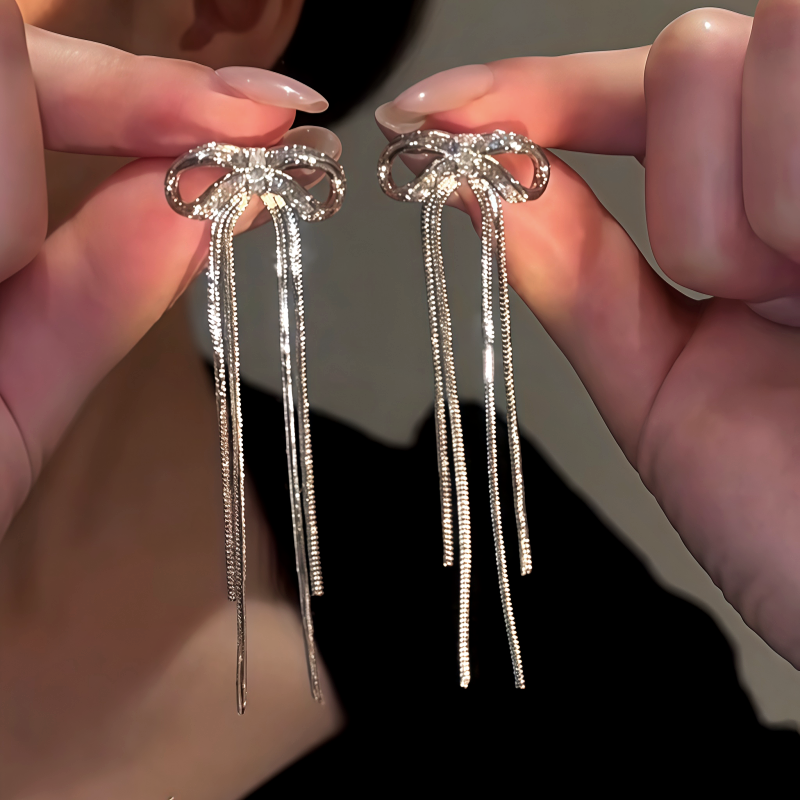 14K Gold-Plated Elegant Zircon Bow Tassel Earrings