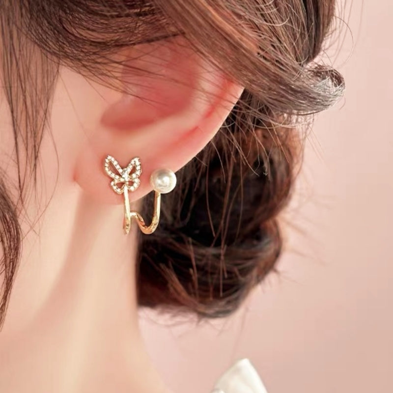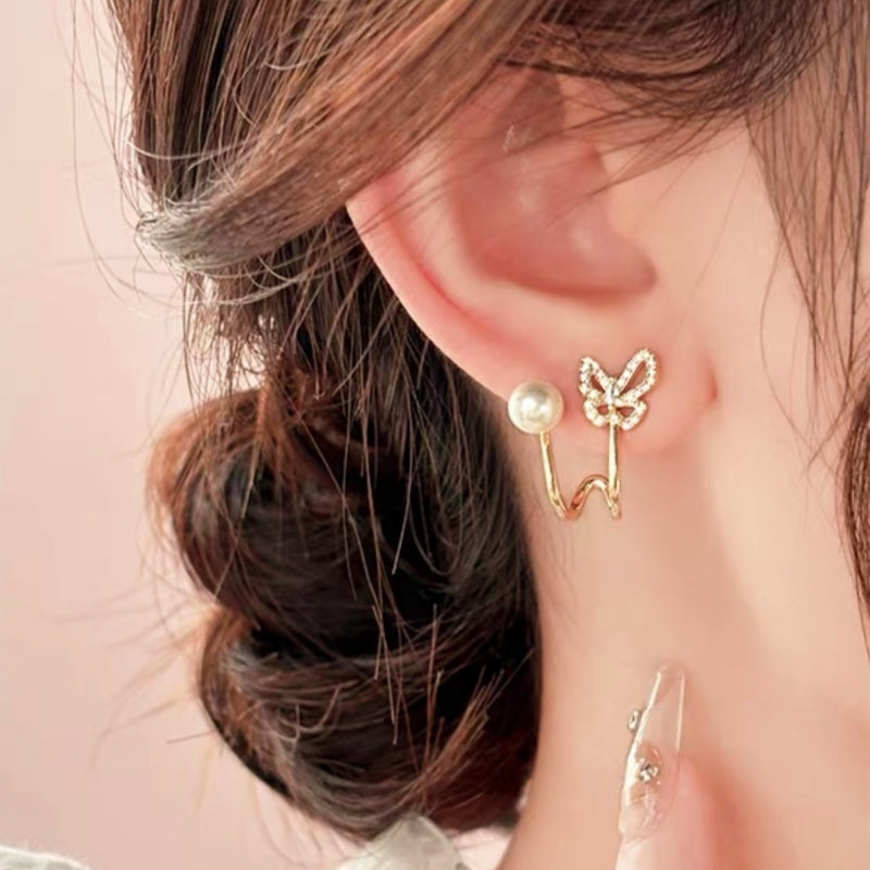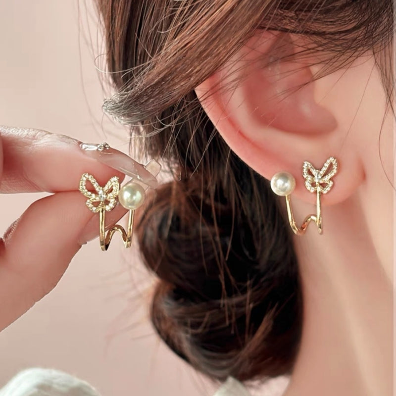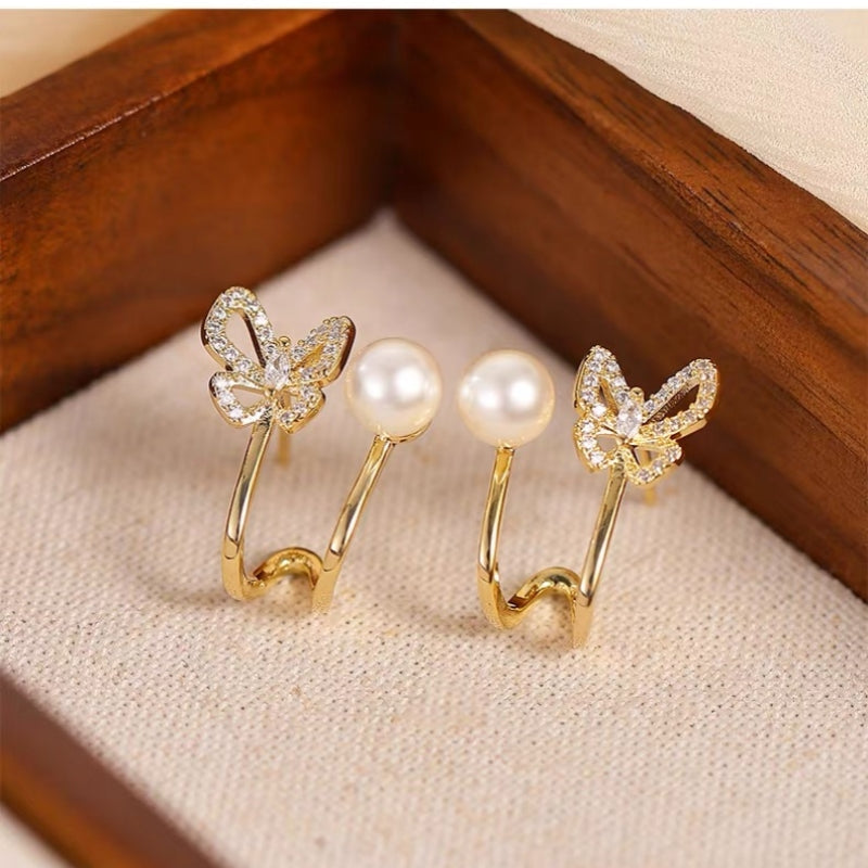 14K Gold-Plated Elegant Zircon Butterfly Pearl Stud Earrings