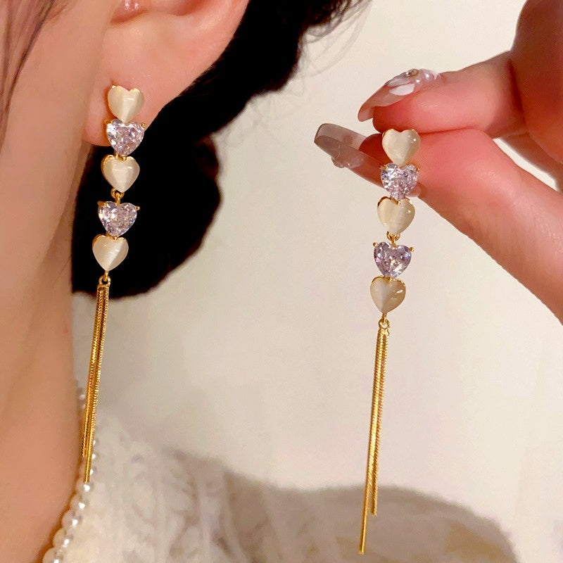 14K Gold-Plated Elegant Zircon Cat's Eye Heart-Design Tassel Earrings
