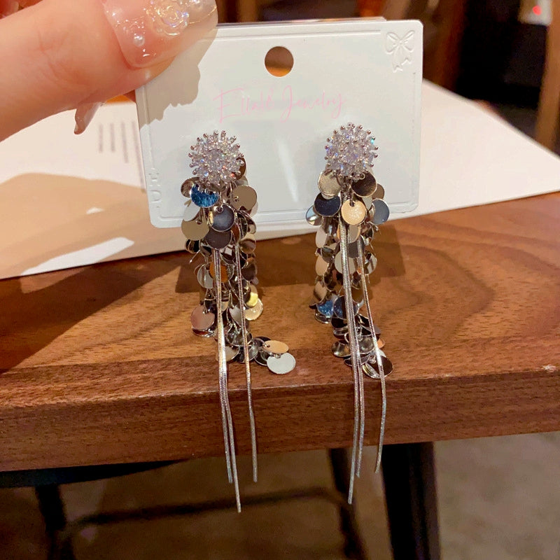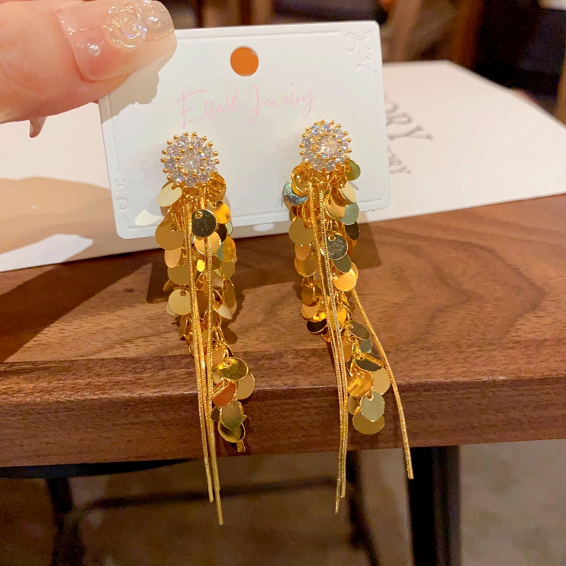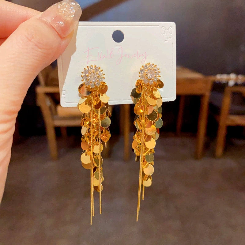 14K Gold-Plated Elegant Zircon Flower Sequin Tassel Earrings