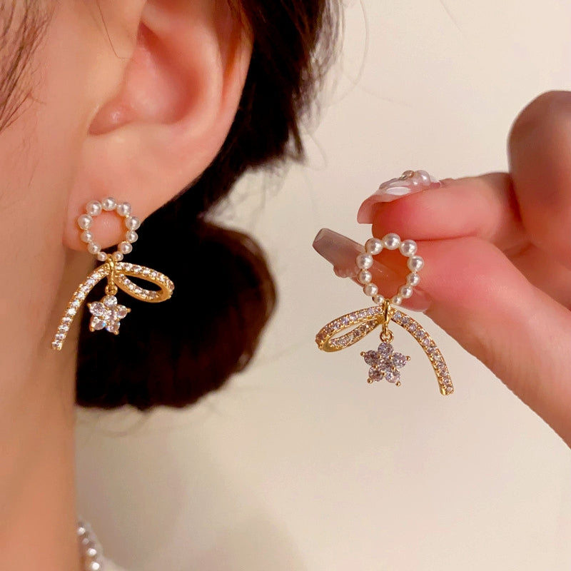 14K Gold-plated Elegant Zircon Pearl Bow Ribbon Flower Earrings