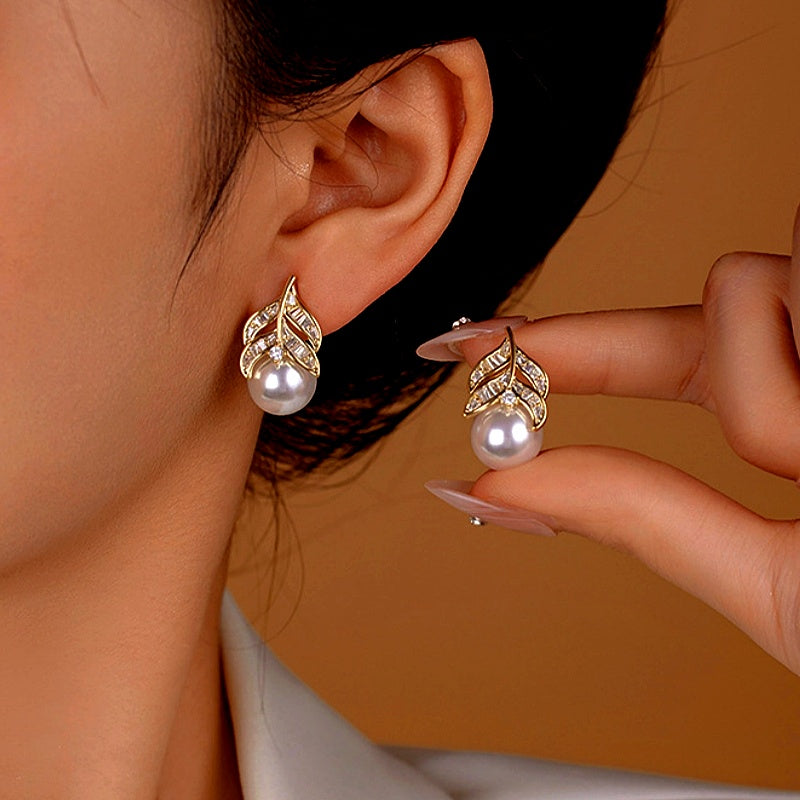 14K Gold-Plated Elegant Zircon Pearl Leaf Earrings