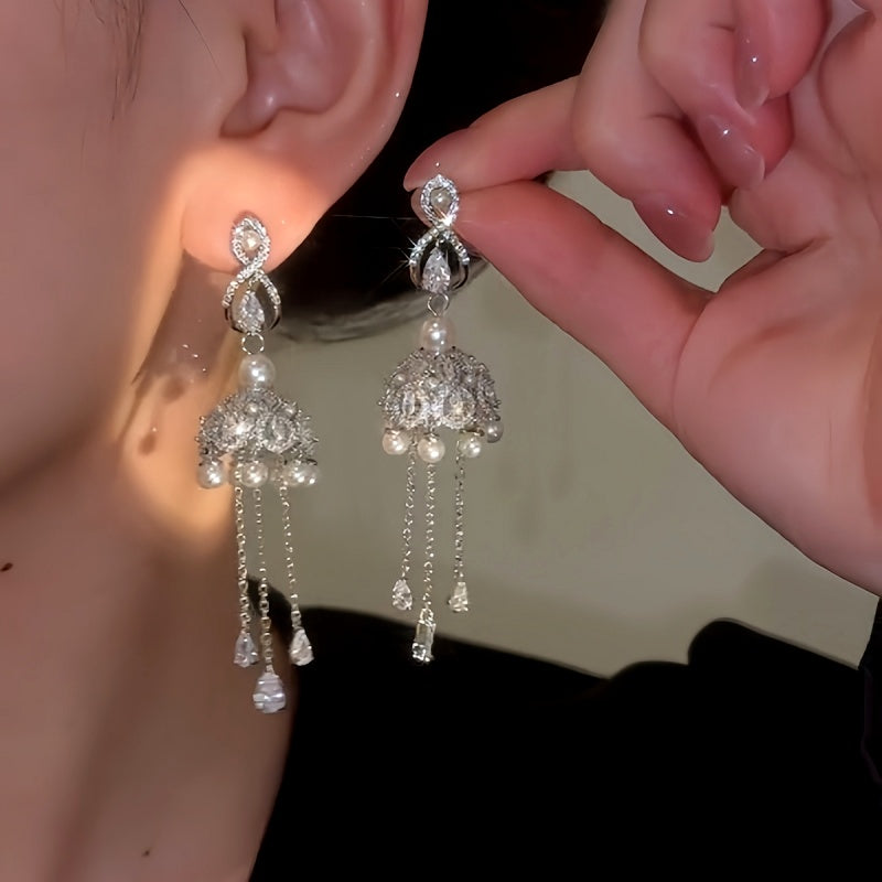 14K Gold-Plated Elegant Zircon Pearl Tassel Bell Earrings